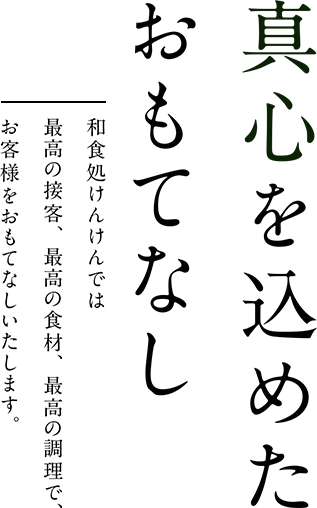 和食処けんけんではご来店のお客様に、最大の真心を込めたおもてなしで感謝の意を示したいと考えております。お客様一組一組にきめ細やかなサービスを提供するために、ディナータイムのご来店は2~3組までとさせて頂いております。